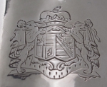 Aiguière casque en métal plaqué d'argent reposant sur un piédouche uni, le corps orné de filets et gravé d'armoiries surmontées d'un heaume de chevalier, l'anse à enroulements filetée.