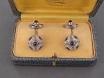 Paire de boutons de manchettes en or blanc de forme ronde, sertis de saphirs cabochons et de petits brillants.