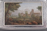 Boite en argent niellé de forme rectangulaire. Le niellé avec des reprise de ciselure. Le couvercle orné d'une plaque en micro-mosaïque représentant un paysage avec en arrière plan une grande demeure probablement italienne. L'intérieur en vermeil.