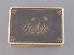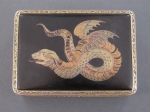 Tabatière rectangulaire en vermeil et écaille piqué d'ors de quatre couleurs représentant sur le couvercle un serpent ailé, au fond un escargot et sur les côtés un serpent. L'intérieur est doublé.